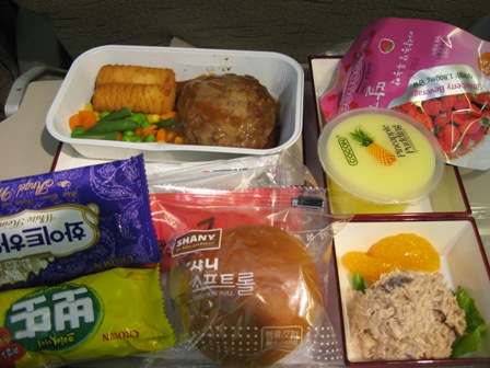機内食のチャイルドミール。行きはハンバーガー。肉かたい。